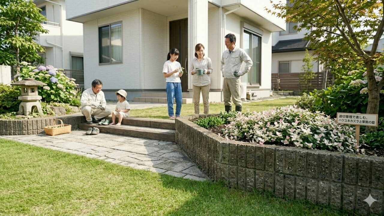 適切に管理され、美しく整えられた日本の庭で、家族がハツユキカズラのある景色を楽しみながら過ごしている完結風景。さて、長々とお話ししてきましたが、最後に「結局、僕は植えても大丈夫なの?」という問いへの答えをまとめます。ハツユキカズラを植えるかどうかの最終的な判断基準は、「あなたがその植物とどう関わりたいか」という一点に集約されます。