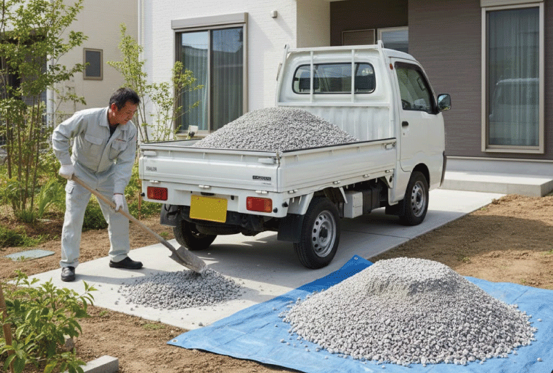 建材店に電話するのは緊張するかもしれませんが、「DIYで庭の砂利を探している個人です」と正直に伝えれば、親切に教えてくれるお店がほとんどです。「〇〇平米の広さに敷きたい」と伝えれば、必要な量を計算してくれます。ただ、ダンプカーで自宅前にドサッと降ろされるので、降ろす場所の確保と、そこから庭まで一輪車で運ぶ「気合い」は必要です。ここを乗り越えれば、予算を大幅に余らせて、その分をちょっと高い植木や照明に回すことができますよ。