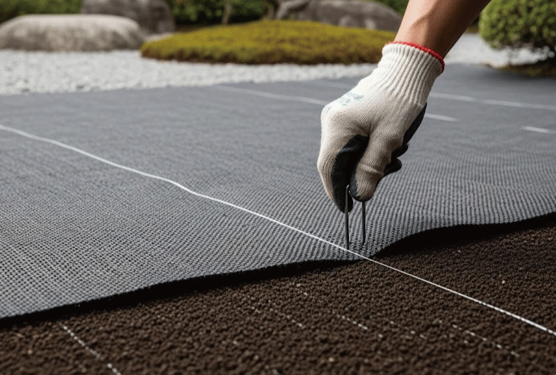 どんなに高いシートでも、太陽の光に晒され続けると劣化します。小道の設計では、必ずシートの上に砂利や人工芝を「厚さ5cm以上」載せて、シートを完全に隠してください。これにより光を100%遮断し、シートを半永久的に長持ちさせることができます。ここをケチって砂利を薄く撒くと、隙間からシートが見えて見た目が悪いだけでなく、劣化を早める原因になるかなと思います。
