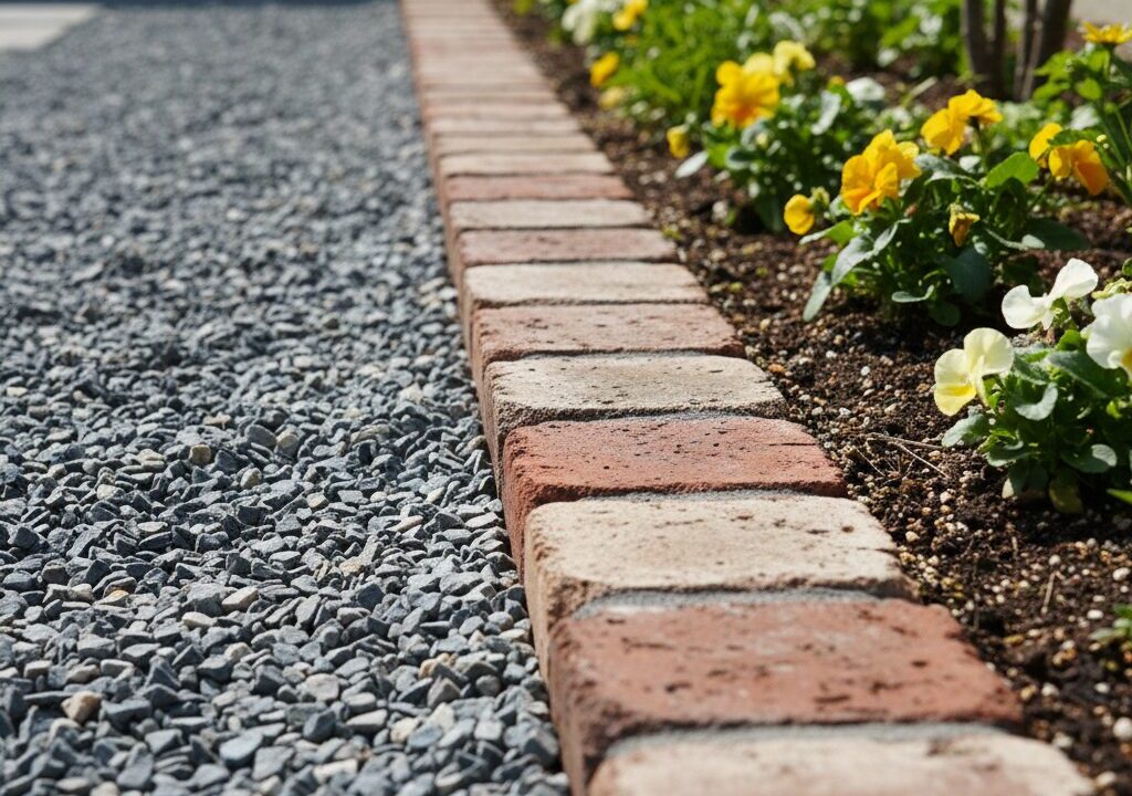 これを防ぐためには、砕石を敷くエリアを物理的に囲う必要があります。レンガを並べたり、プラスチック製の「エッジ材」を埋め込んだりして、土と石を完全にセパレートしましょう。