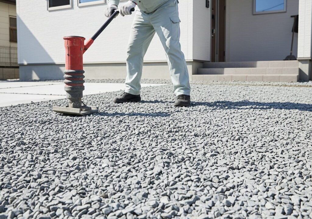 ちなみに、転圧の際に少しだけ「水」を撒くと、石同士の摩擦が減ってより隙間に入り込みやすくなります。こうした些細な手間が、5年後の地盤の安定に直結しますよ。
