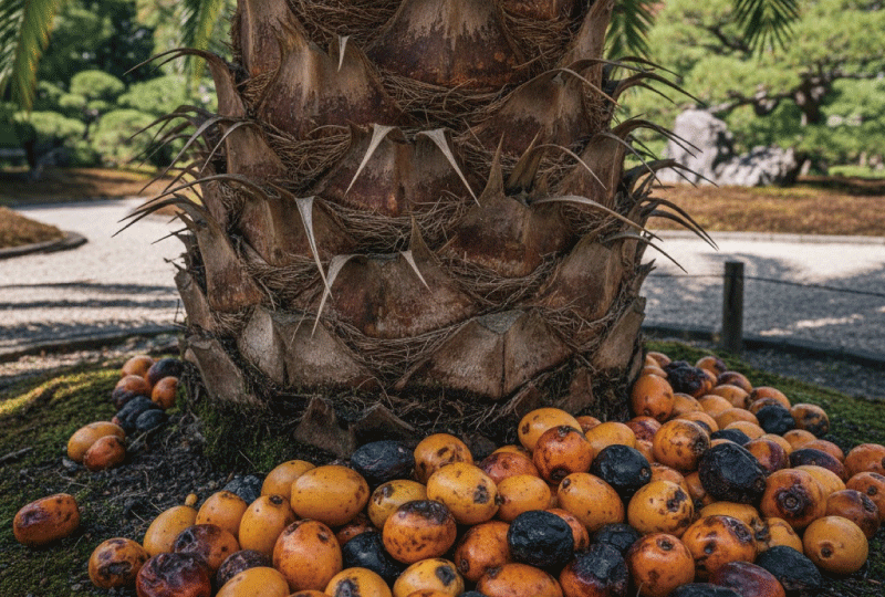 次にカナリーヤシ(フェニックス)ですが、これもトゲが猛烈に危険です。葉の根元に並ぶ巨大なトゲは、厚手の革手袋すら簡単に貫通し、深く刺さると激しい痛みと腫れを引き起こします。小さなお子さんやペットがいる家庭では、絶対に近づけられません。さらに、これらの大型ヤシは大量の「実(シードポッド)」をつけます。この実が完熟して地面に落ちると、夏の暑さでドロドロに腐敗し、鼻を突くような悪臭を放ちます。そこへハエやゴキブリ、カラスなどが集まってくるという、お世辞にも衛衛的とは言えない状態になりやすいんです。リゾート地では専任のスタッフが毎日清掃していますが、それをあなたの家庭で毎日続けられますか?「見た目」の豪華さと引き換えに失うものがあまりに多いことを、冷静に判断してほしいかなと思います。