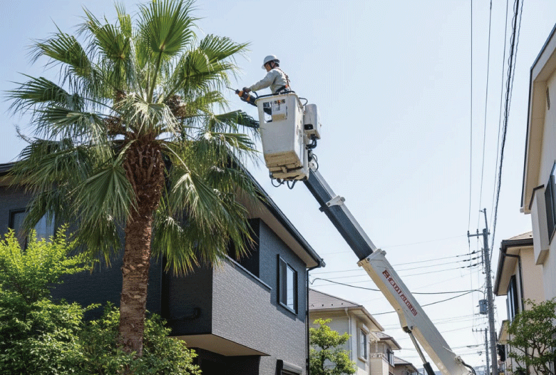 ヤシの木が順調に成長し、5メートル、7メートルと高くなっていくと、次は「剪定」が大きな負担になります。ヤシの葉は一枚が非常に大きく重いため、枯れたまま放置しておくと、台風などの強風時に落下して屋根を傷つけたり、通行人に当たったりする危険性があります。美観を維持するためにも定期的なカットが必要ですが、自分ではしごをかけて作業できるのは、せいぜい3メートルが限界でしょう。それ以上の高さになると、作業員の落下事故を防ぐための安全対策として、必ず「高所作業車」の投入が必要になります。この車両代が、皆さんの維持費を想像以上に圧迫することになるんです。