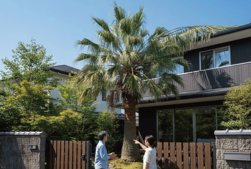 ヤシの木を植える場所を選ぶ際、「自分の土地の端っこ」を狙う方が多いのですが、これは近隣トラブルの火種になります。ヤシの葉は一枚が非常に長く、成長すると放射状に大きく広がります。植えた当初は小さな苗でも、数年後には隣家の境界線を優に超え、お隣さんの屋根の上に葉が覆いかぶさったり、雨どいに巨大な枯れ葉が詰まって雨水が溢れ出すといったトラブルが頻発するんです。さらに、高くなったヤシの木が風に揺れる際、葉が隣家の壁を「バシバシ」と叩く騒音被害も、私たちが現場でよく受ける相談の一つです。こうした小さなストレスの積み重ねが、良好だったはずの近隣関係に亀裂を入れてしまうんですね。