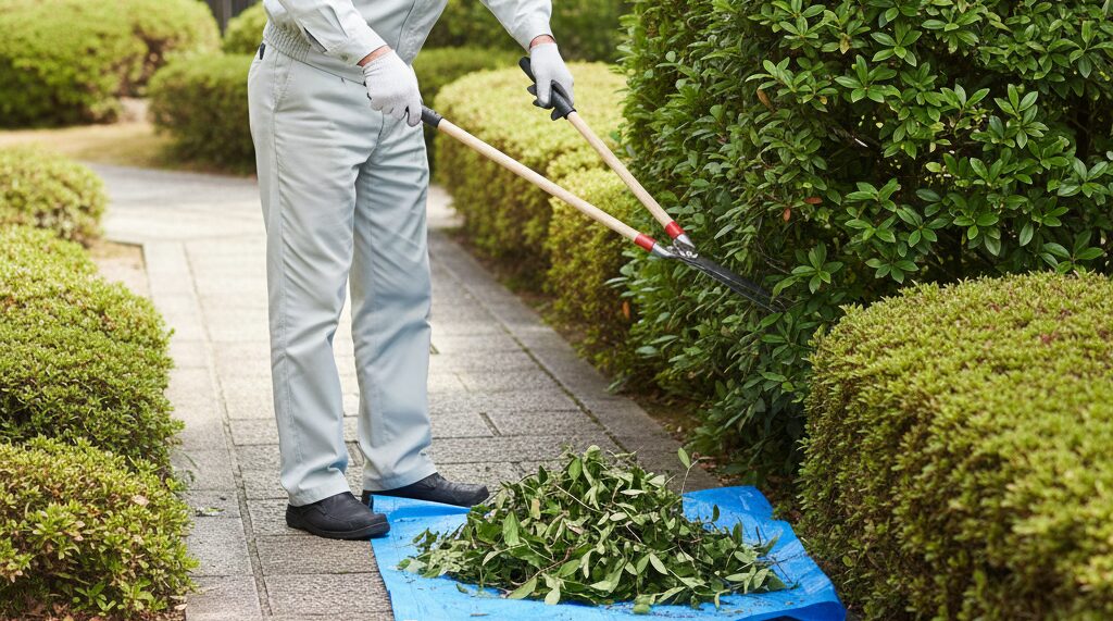低木は安全面ではラクなことが多いですが、刈り込み量が多いとゴミが出ます。ゴミが出ると処分費が乗る。ここが盲点です。さらに、トゲが強い樹種や葉が硬い樹種は作業が遅くなることがあります。低木=安い、と決め打ちしないのがコツです。